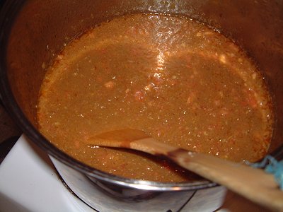 2. すりおろしたタマネギを、大量の油で煮る。油はあとで取り除くので、とにかくたくさん。ここで油を少なくするとタマネギがうまく仕上がらない。