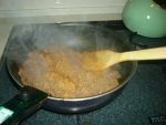 まずみじん切りにしておいたタマネギ、ショウガ、ニンニクを多めの油でいためます。油はサラダオイルでも良いですが、もしギー(バターから脂だけを取り出したもの)があれば、その方がこくが出ます。油を多めにするのは、タマネギをうまく炒めるためと、後でうまくドライカレー状にするためです。タマネギがキツネ色になるまで炒めてください。焦がさないように。