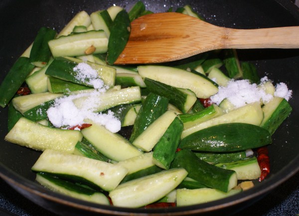 そこにキュウリを投入してさっと炒めます。キュウリがくったりするまで炒めてはいけません。しゃっきり感を残します。