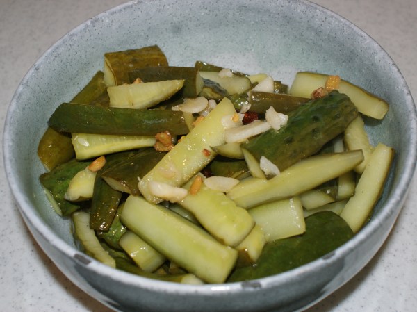 キュウリの色が変わり始めたらすぐ火を止め、容器に移します。このまま食べると結構むせますから、冷蔵庫で冷やしてから食べることをお勧めします。