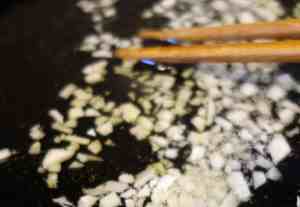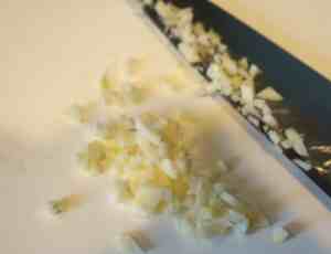 ニンニク大1かけをみじん切りにします。フライパンにオリーブオイルをたっぷり入れます。バターを使用しませんので、オリーブオイルを多めにしてください。