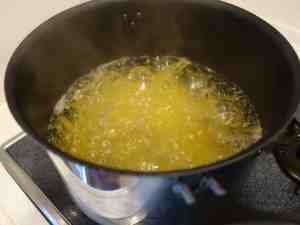 オリーブオイルの中にニンニクを入れて弱火にかけます。ふつふつと泡が出て来たら火を止めます。雑味が出ますのでニンニクを焦がさないようにしてください。