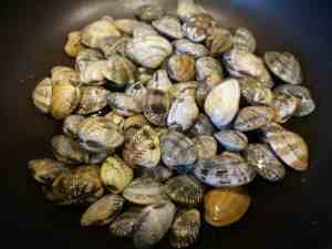 別のフライパンあるいは鍋で、アサリを白ワインを使って酒蒸し状態にします。他のレシピを見ると、熱したオリーブオイルの中に直接アサリを投入するものが多いようですが、冷たいワインの中に砂出ししたアサリをよく洗って放り込み、火にかけます。