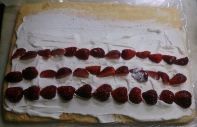 11.9を広げたラップの上に置き、10の生クリームをぬり、イチゴをならべて巻く。