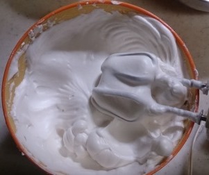 卵白がほぐれたら高速にして、ツノが立つまで泡立てる。